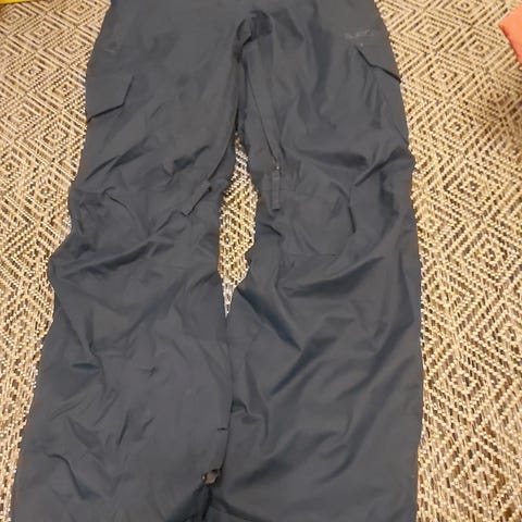 Button lasketteluhousut ja L. Haalea tahra toisessa reiden etuosassa. Toisessa lahkeessa muutama pieni reikä ja lumilukon kankaassa myös pienet reijät, muuten vielä hyvät housut.
