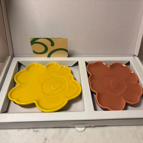 Käyttämätön paketti Marimekon Unikko 60-vuotta lautasia. Koko 13cm. Paketissa kaksi lautasta. Värit valkoinen ja koralli.