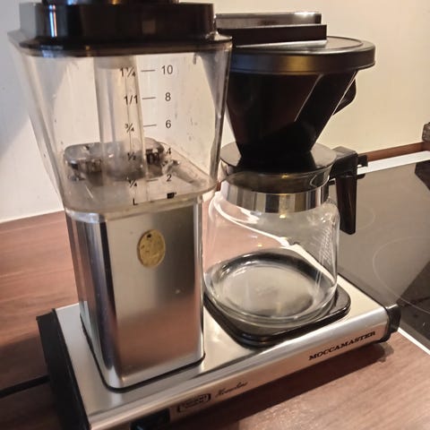 Toimiva Moccamaster, vanhempi malli jossa ei automaattista virrankatkaisua. Vesisäiliön kannessa pieni halkeama, ei vaikuta käyttöön. Lasipannu vaihdettu uuteen viime vuonna. Nouto Tontunmäestä.