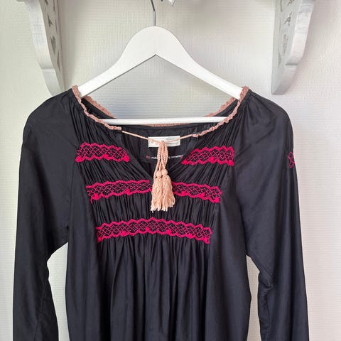 Yläosa kudottua puuvillaa, alaosa trikoopuuvillaa. Kietaisumalli, ihanat kirjailut yläosassa edessä sekä takana. Helma kauniin mallinen pyöristetty ja keskeltä edestä lyhyin. Kesällä kiva hihaton mekko ja talvella hauska kerrospukeutumiseen.