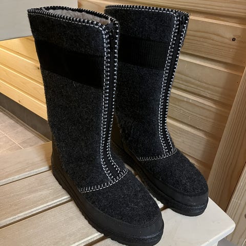 Ruskehtavan harmaat huopikkaat joissa kumipohja. Ostettu kirpputorilta 30€:lla miehelle mutta osoittautuivat liian pieniksi. Kokoarvio noin 40.