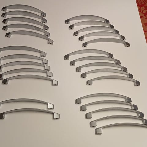 13,5cm leveys, ruuviväli 13cm. Olleet keittiön kaapinovissa. Bauhausista muistaakseni. Osan ruuveista saa halutessaan mukaan.