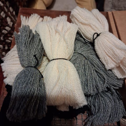 Vuosikymmeniä vanha ryijykuvasto-vihkonen sekä ryijylankavärikartta. Kuvastossa kuvattuna kymmeniä erilaisia ryijyjä, ei teko-ohjeita.