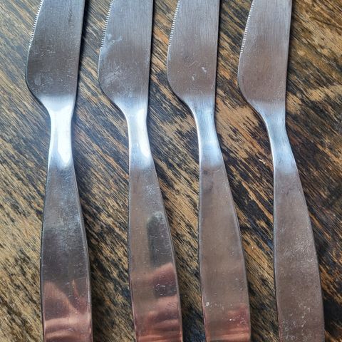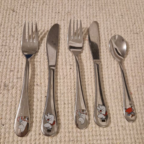 Alfredo Häberlin Iittalalle suunnittelemat lasten aterimet: haarukka, veitsi ja lusikka. Vain vähän käytetyt