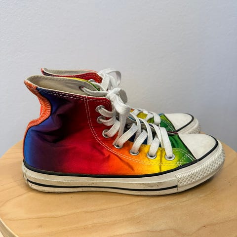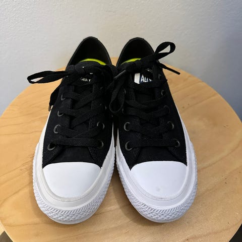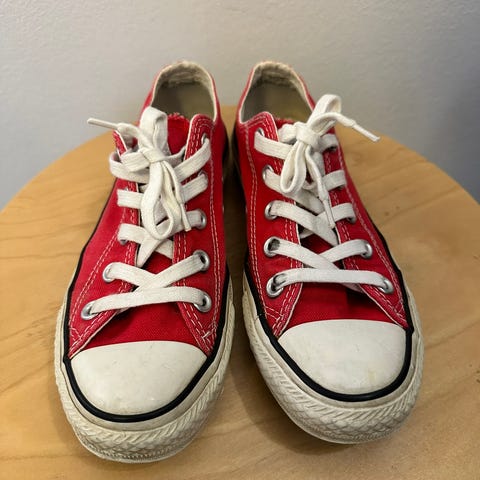 Converse Tennarit kengät, koko 35, väri punainen. Korkeavartiset tennarit, joissa valkoiset nauhat ja kärjet. Materiaali kangas.