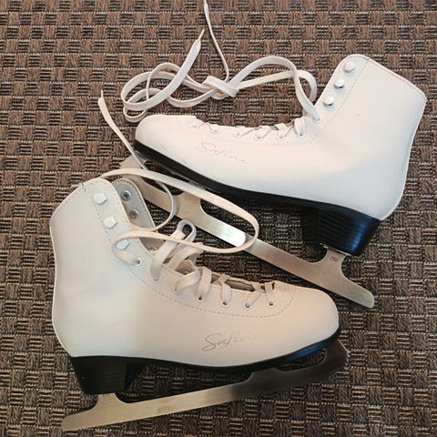 Hyvä, vähän käytetty kunto, ks. Kuvat. Teroittaisin ennen käyttöä. Suojat saa mukaan halutessaan, niiden kunto tyydyttävä. Pohjallisen mitta 26cm.