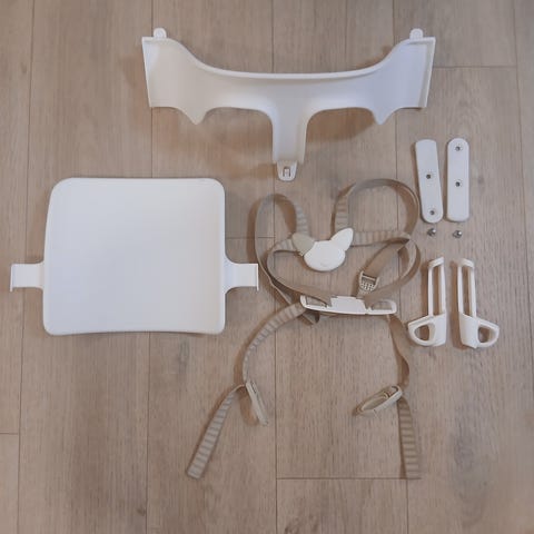 Stokke babyset. Pientä kulumaa huomattavissa, mutta ei vaikuta käyttöön. Mukaan vaihdettava päällinen joka on 2 puoleinen. Malli on vanha, eli ei ole säädettävä.