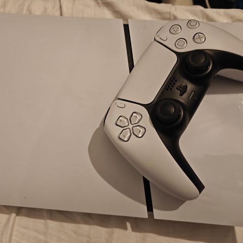 Sony Playstation 5 Slim Standard Edition 2023 1 TB pelikonsoli valkoisella värillä. Mukana yksi DualSense-ohjain, Gran Turismo 7 -peli ja tarvittavat kaapelit. Kaikki yht. 400€