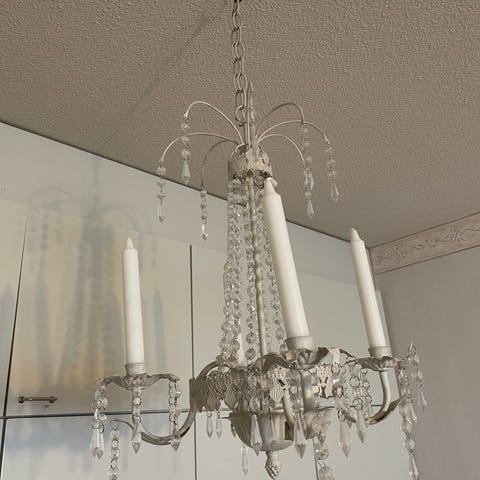 Täysin ehjä, suoraan käytöstä myyntiin kaunis ja koristeellinen kynttiläamppeli. Tähän voit laittaa led-kynttilät tai pitää vain koristeena. Kynttiläkupit eivät ole lasia. Kaikki prismat tallella ja ehjiä. Runko on vaaleaksi maalattua metallia. Sopii romanttiseen sisutukseen. Voin toimittaa omien menojeni mukaan Keski-uudellemaalle.