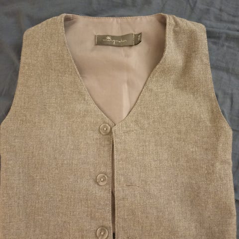 Suorat housut, liivi ja valkoinen paita