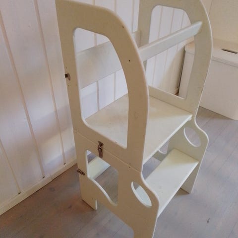 Puusepän tekemä, ja kunto yhä kuin uusi. Korkeutta voi säätää kolmelle korkeudelle. Takana on tanko joka suojaa taaksepäin kaatumiselta, ja edessä leveämpi este joka suojaa edestä tipahtamiselta. Meillä lapsi tykkäsi kovasti osallistua keittiöhommiin tämän avulla.