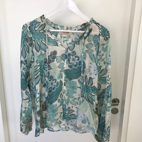Kiiltävä, kukkakuvioinen kangas. Helmaan laitettu kuminauha. Vain nouto ja käteismaksu.
