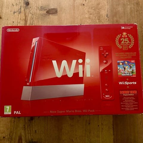 Nintendo New Super Mario Bros. Wii pelikonsoli punaisena värinä. Konsoli on suunniteltu Nintendo Wii -alustalle ja sisältää pelipaketin, joka juhlistaa sarjan 25-vuotista historiaa.