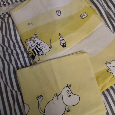 Myynnissä uusi, yhden hengen pussilakanasetti. Kuvitus Muumi-kirjasta Vaarallinen juhannus. Tuote ei ole enää tuotannossa. Laadukasta Finlayson-laatua. Avaamaton pakkaus. Lähettäminenkin onnistuu.