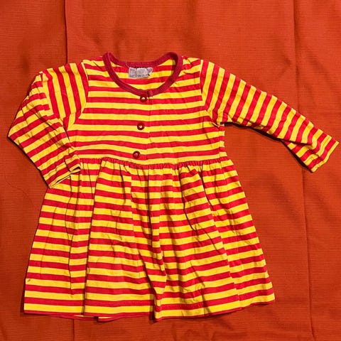 Marimekon pinkki-ruskearaitainen mekko.