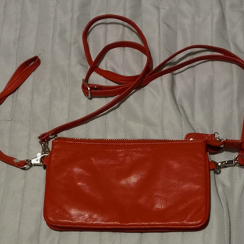 Uutta vastaava A.Eriksson nahkalaukku. Ulkosivuilla vetoketjutaskut, yksi vetoketjutasku ja toisella sivulla avotasku. Leveys 20 cm, korkeus 21,5 cm, Syvyys 6,5 cm. Hihnan pituus säädettävissä.