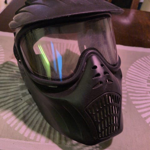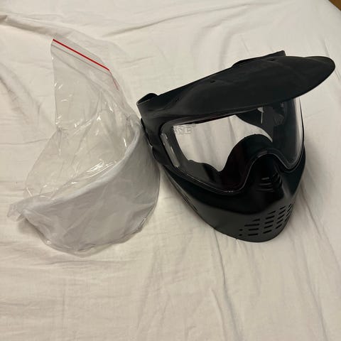 Musta airsoft maski jossa kirkas silmäsuoja ja säädettävä hihna. Suojaa kasvoja ja silmiä airsoft-peleissä tai muussa vastaavassa toiminnassa. Hengittävä rakenne ja kestävä materiaali. Silmasuojassa naarmuja, muuten kunto hyvä.