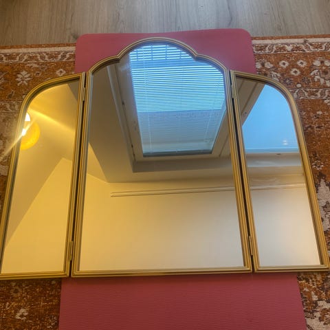 Myydään kultareunainen peili. Peilissä jalka, mutta se on itse värkätty seinälle ripustettavaksi, joten molemmat vaihtoehdot löytyy.