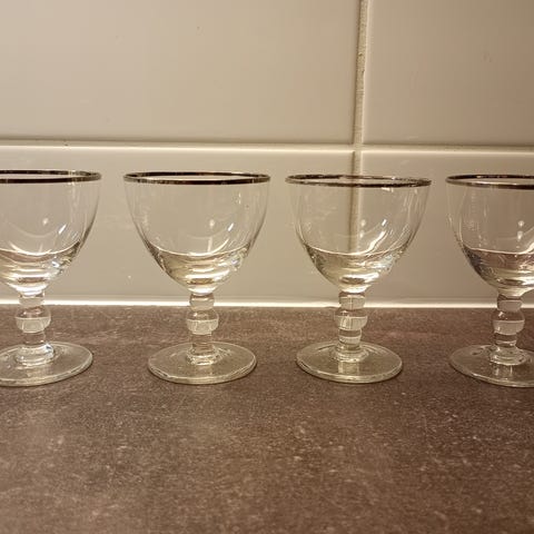 Kuusi kappaletta kultareunaisia liköörilaseja. Hyvässä kunnossa, vähän käytettyjä.
