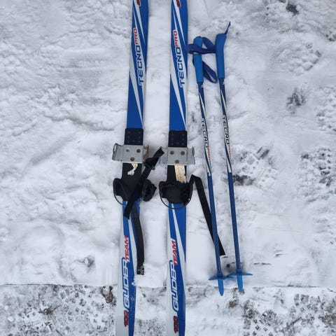 Lasten kenkiin laitettavat sukset ja sauvat. Vanhat ja käytetyt mutta ehjät.