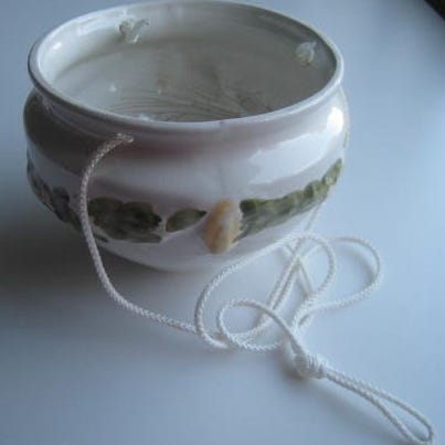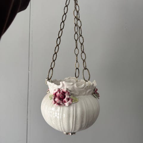 Valkoinen posliini amppeli, metallivaijerit. Halkaisija noin 18 cm, korkeus noin 14 cm. Vaijereiden pituus noin 50 cm. Ylhäällä koukku. Kaunis, siro amppeli.