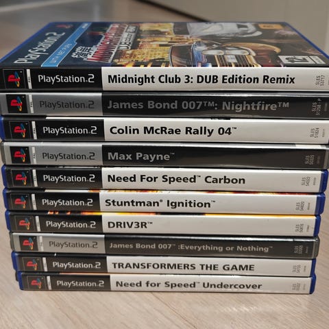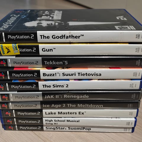 Kuvan läjä pelejä, joiden kunto (levyt, kannet, ohjekirja) vaihtelee. Osasta voi puuttua ohjeet, mutta pelit kuitenkin kaikki tallessa.