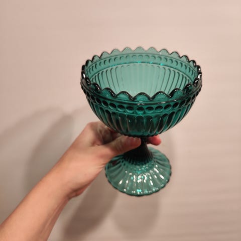 Iittala jälkiruokakulho, valmistettu vihreästä lasista. Kulho on jalallinen ja sen muotoilu sisältää koristeellisia yksityiskohtia. Soveltuu esim. jälkiruokien tai pienten tarjoilujen tarjoiluun.