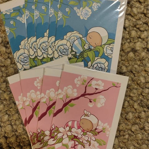 Käyttämättömiä kortteja vauvaonnitteluihin - kaikilla ikää jo useampi vuosikymmen - ei todennäköisesti tule samoja kortteja onnitteluissa ;) Kaikki tuolta 1980-2000-l alusta, unohtuneet sittemmin minulla kaappeihin ja löytyneet taas muuton jälkeen
