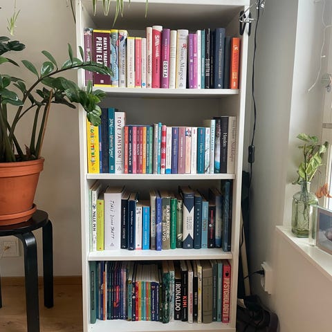 Valkoinen kirjahylly hyvässä kunnossa. 240cm korkea, 108 cm leveä ja 30 cm syvä. Hyllyjen korkeudet ovat säädettävissä.