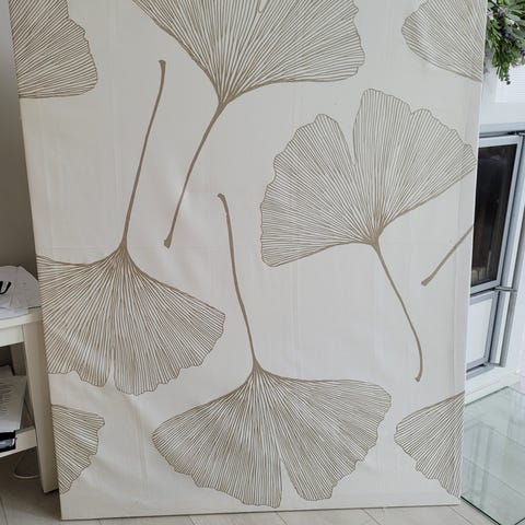 Marimekon mustavalkoinen kevätjuhla sisustustaulu. Kangas pingotettu puukehykseen.