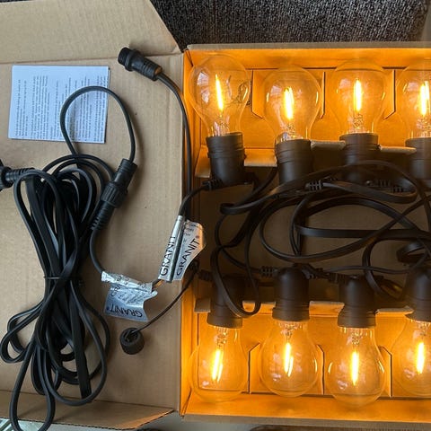 Granit valosarja, soveltuu sisä ja ulkokäyttöön ja muille vuodenajoille. Sarjassa on useita lamppuja, jotka on liitetty mustaan valosarjaan.