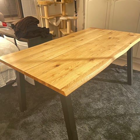 Myydään tuppeensahatusta tammesta itse tehty ruokapöytä. Pöytä on ollut meillä ulkona kylmässä kasvihuoneessa, mutta sopii myös sisälle.