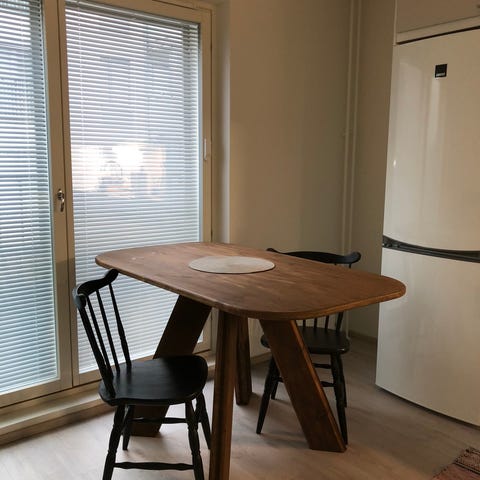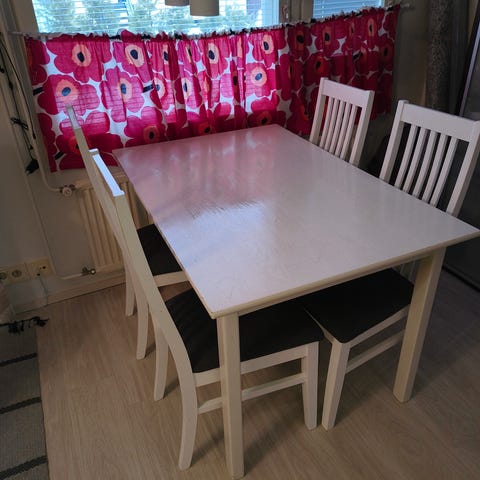 Noin viisi vuotta vanhat. Käytönjälkiä löytyy hieman. Kuvassa näkyy. Tukeva pöytä. Jatkopala löytyy. Tuolit erikseen. 30€/kpl.