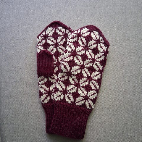 Lapaset villasekoitelangasta. Kämmenen pituus ranteesta sormenpäihin 16,5 cm. Lapselle tai pieneen aikuisen käteen.