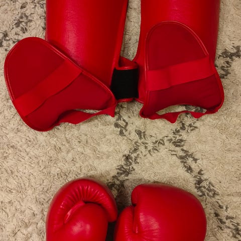 Hyvässä kuunossa olevat 14oz. Iron fight gear hanskat ja L koon blue corner säärisuojat