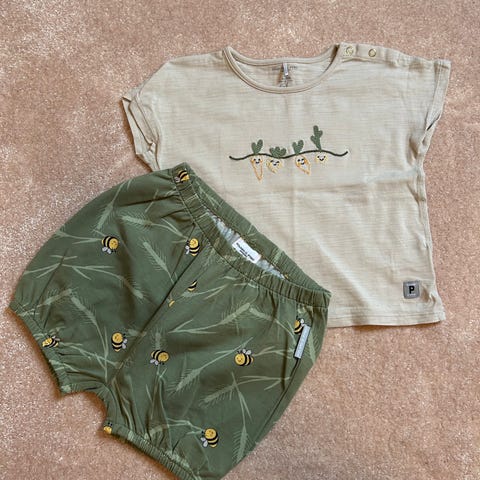- Polarn o. Pyret tummansini-valkoraidalliset pitkähihainen paita ja leggingsit. Koko molemmissa 74. Hp. 18e