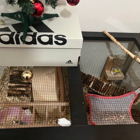 Ollut käytössä kahdella gerbiilillä. Mukaan kuljetuskoppi, kylpyastia, puulinna ja puisia sisusteita.
