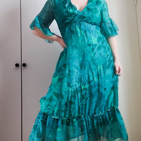 Käyttämättä jäänyt satiininen pohjemittainen mekko, väri kauniin roosa tai vanharoosa. Erittäin hyvä kunto. Materiaali 100% polyester. Menee L-kokoiselle kuten kuvassa, mutta jää lyhyeksi ja pienen oloiseksi. Suosittelen M-koolle. Sopii monen pituiselle. kai-kai 55cm, kuminauhavyötärö ja pituus takaa on 122cm. Vyö irrotettavissa ja sidottavissa kuinka haluaa. Nätit röyhelöt hihoissa.