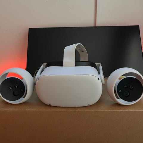 Oculus Quest 2 virtuaalitodellisuuslaite, joka sisältää valkoisen VR-laitteen, kaksi ohjainta ja alkuperäisen liitäntäkaapelin.