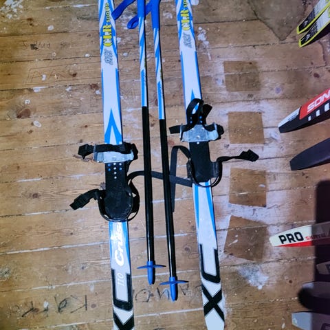 Lasten 110 cm pituiset ensisukset ja 80 cm pituiset sauvat. Sukset kiinnitetään kenkiin siteillä. Sukset ja sauvat ovat olleet useilla lapsilla käytössä, mutta ovat ehjät ja toimivat edelleen hyvin. Suksissa ja sauvoissa on tussimerkinnät.