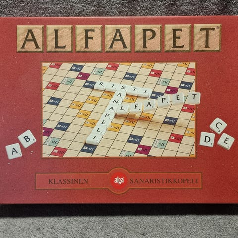 Alfapet-sanapeli. Sama peli-idea kuin Scrabblessa. Kaikki osat tallessa. Siisti kunto.