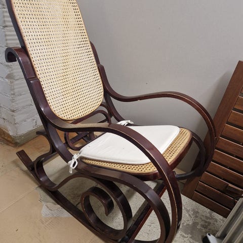 Pienet viat oikeanpuoleisessa käsinojassa, rottinki lähtenyt kulumaan, mutta tämän saa korjattua eikä vaikuta toimivuuteen.