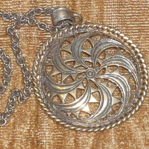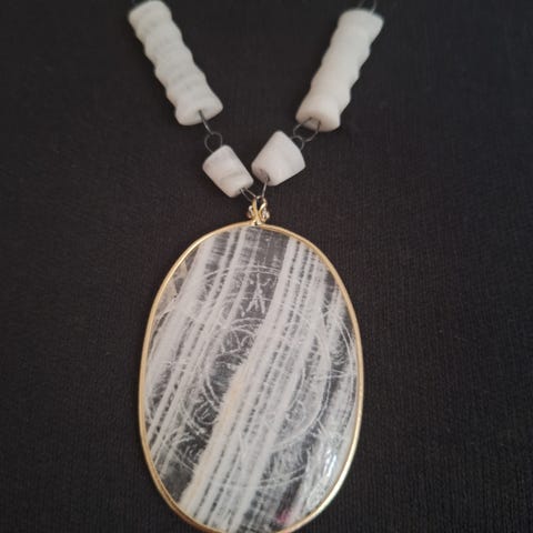 Kaulakoru pyöreällä riipuksella. Ketjun pituus on noin 42 cm ja korun halkaisija noin 2,7 cm.