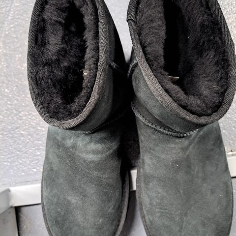 UGG nilkkurit/nilkkakengät koossa 38, tummansiniharmaa väri. Kengät on valmistettu mokkanahasta ja niissä on matala korko. Sisävuori on pehmeä ja lämmin, soveltuu käytettäväksi viileämpinä päivinä. Koron korkeus on 3 cm. Koroissa kulumaa. Vuoren karva nilkan kohdalta jonkin verran kulunut. Kulumat ja vesifläkit huomioitu hinnassa.