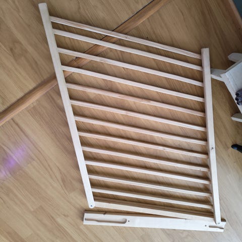 Turvaportti, säädettävissä 84-90cm leveyssuunnassa, korkeus 77,5cm. Portti on toimiva, mutta vaatii aivakin yhden säädettävän kiinnikkeen lisää. Portin mukana tulee 2 ehjää kiinnikettä ja 1 josta on lähtenyt muovinen osa pois.