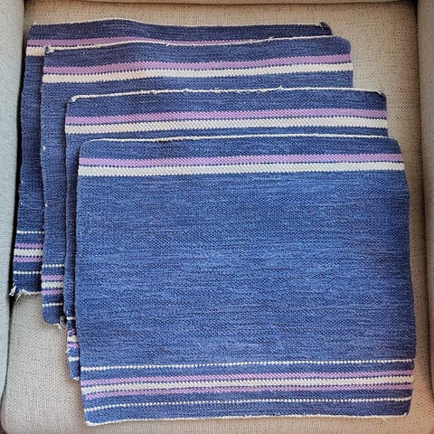 Neljä kaunista, sinivalkoista pöytätablettia. Jokaisessa tabletissa omanlaisensa kaunis kuvio kukkamaljakosta. Myydään kaikki neljä kerralla.