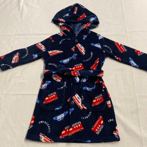 Kiinteä vyö, taskut ja huppu.