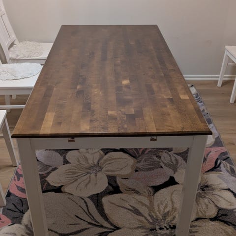 Annetaan kuvan ruokapöytä ja 4 tuolia. Tuolin päälliset saa mukaan.