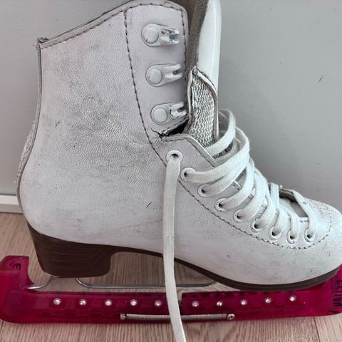 Myydään käytettynä ostetut, yhden kevään luistelukoulussa käytetyt luistimet. Sisämitta n. 19 cm. Yksi hakanen puuttuu nilkasta, mutta ei haitannut sitomista (ks.kuva). Suojat kuuluu kauppaan.