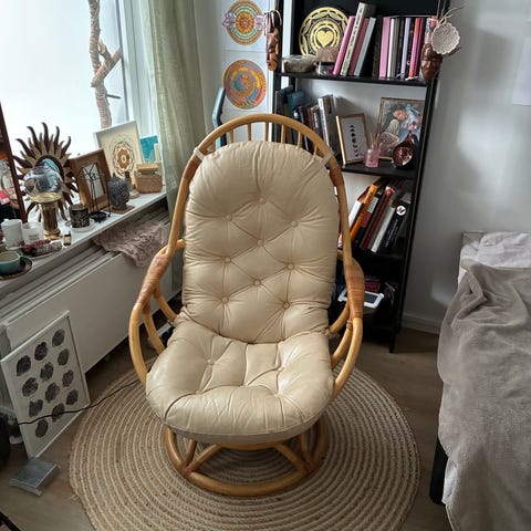 Rottinki materiaalia oleva pyöreä nojatuoli, vaalean värinen. Sopii sisustukseen ja rentoutumiseen. Nouto Kampista.